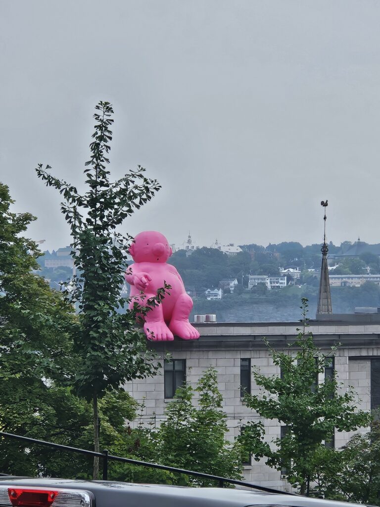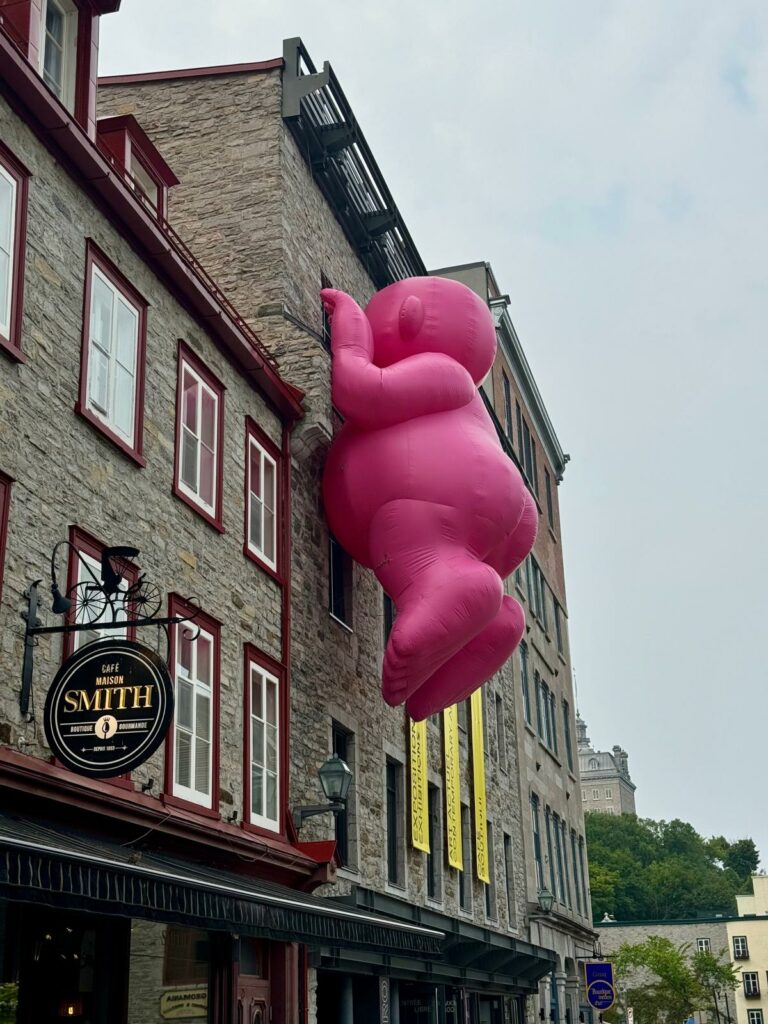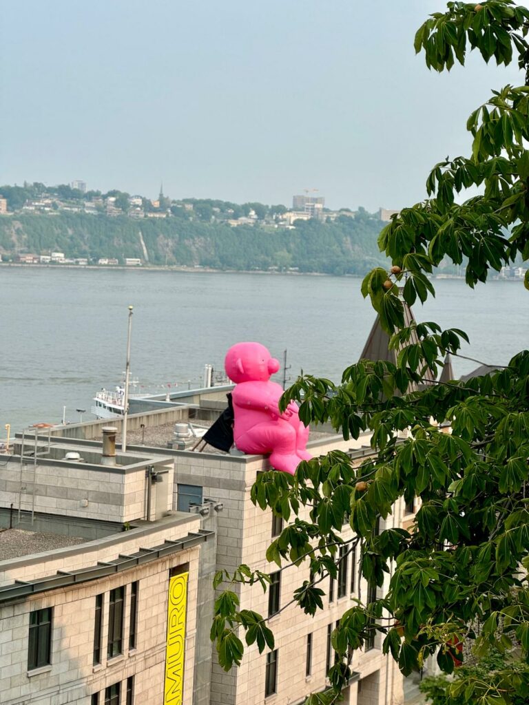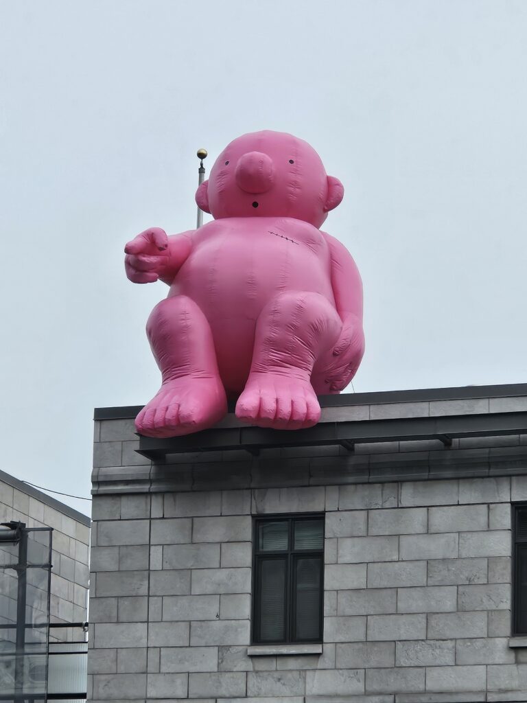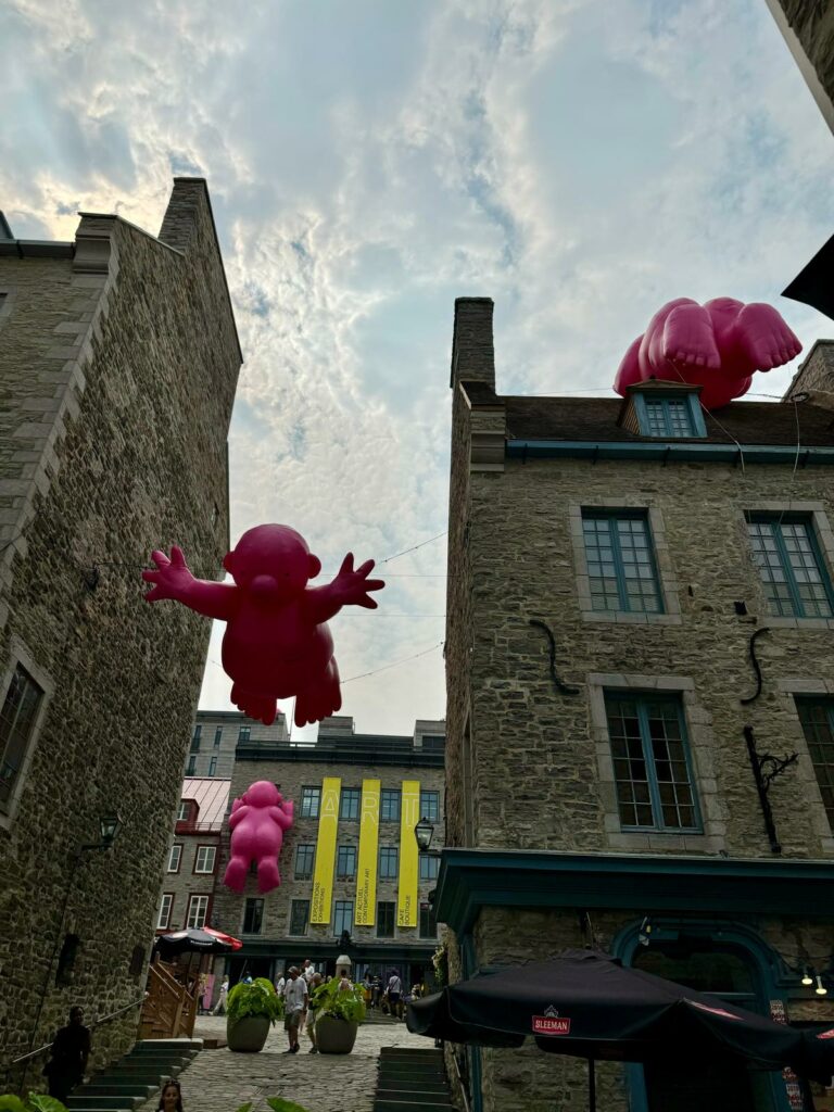 De nombreux bonhommes roses sont accrochés aux murs de la ville, nous apprenons qu’il s’agit d’une oeuvre artistique créée par… Philippe Katerine.