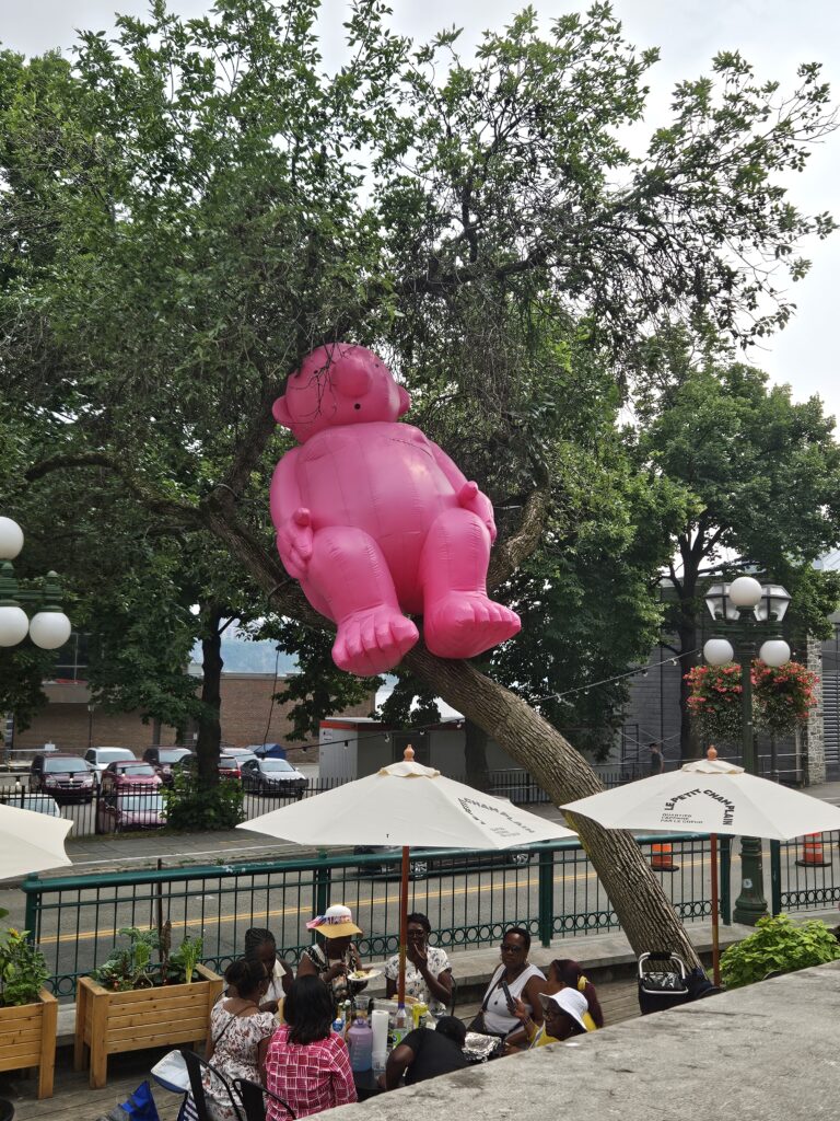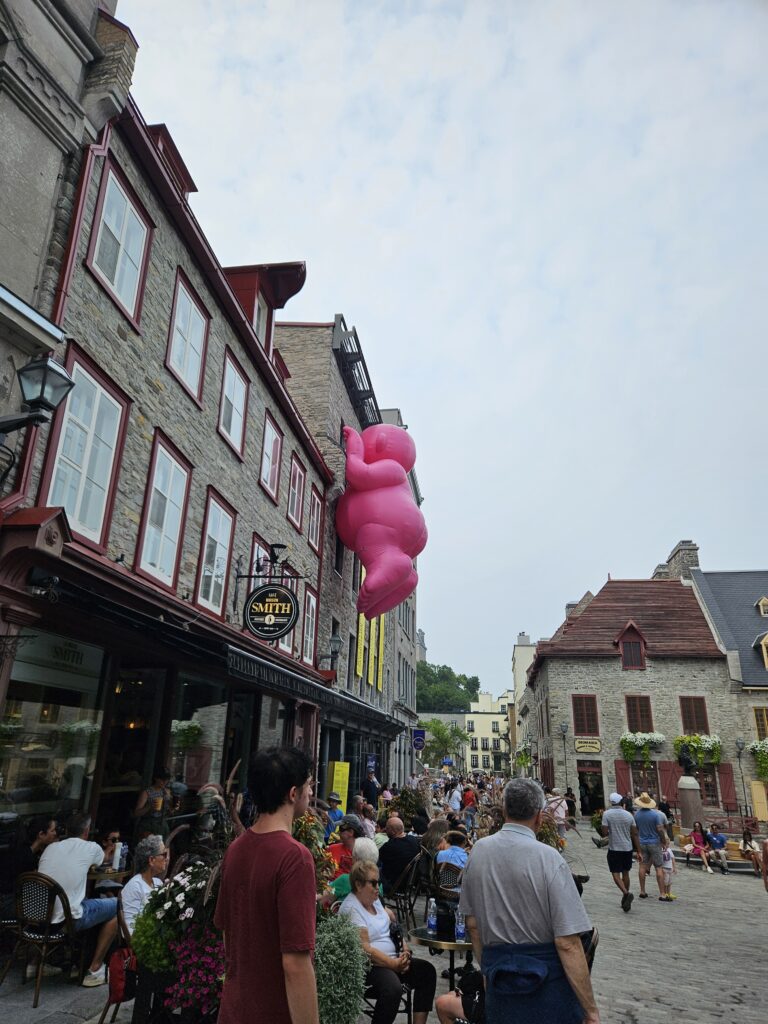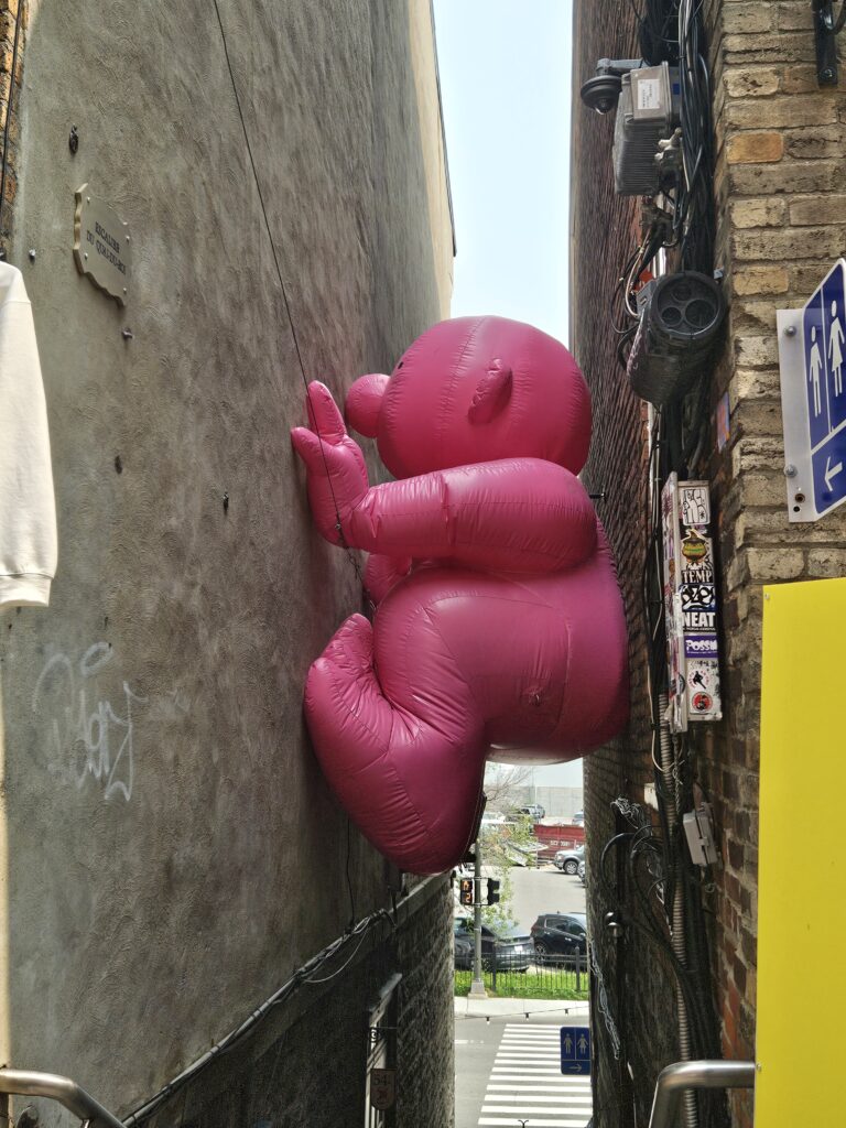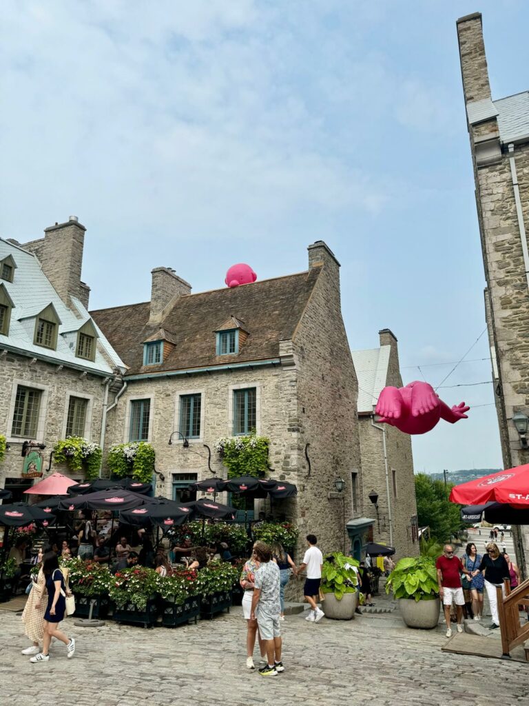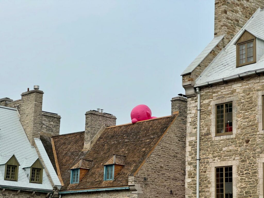 De nombreux bonhommes roses sont accrochés aux murs de la ville, nous apprenons qu’il s’agit d’une oeuvre artistique créée par… Philippe Katerine.