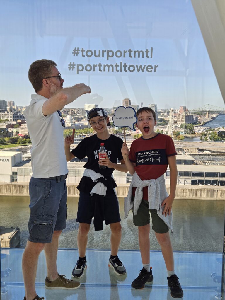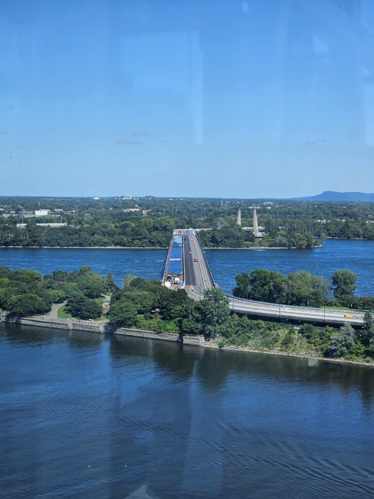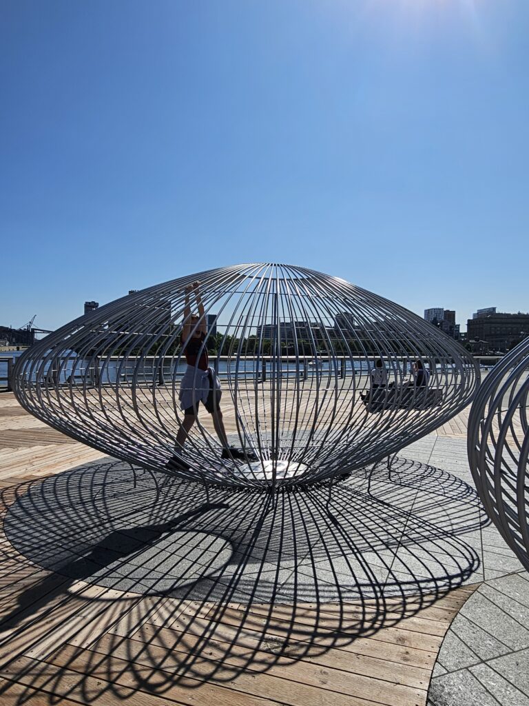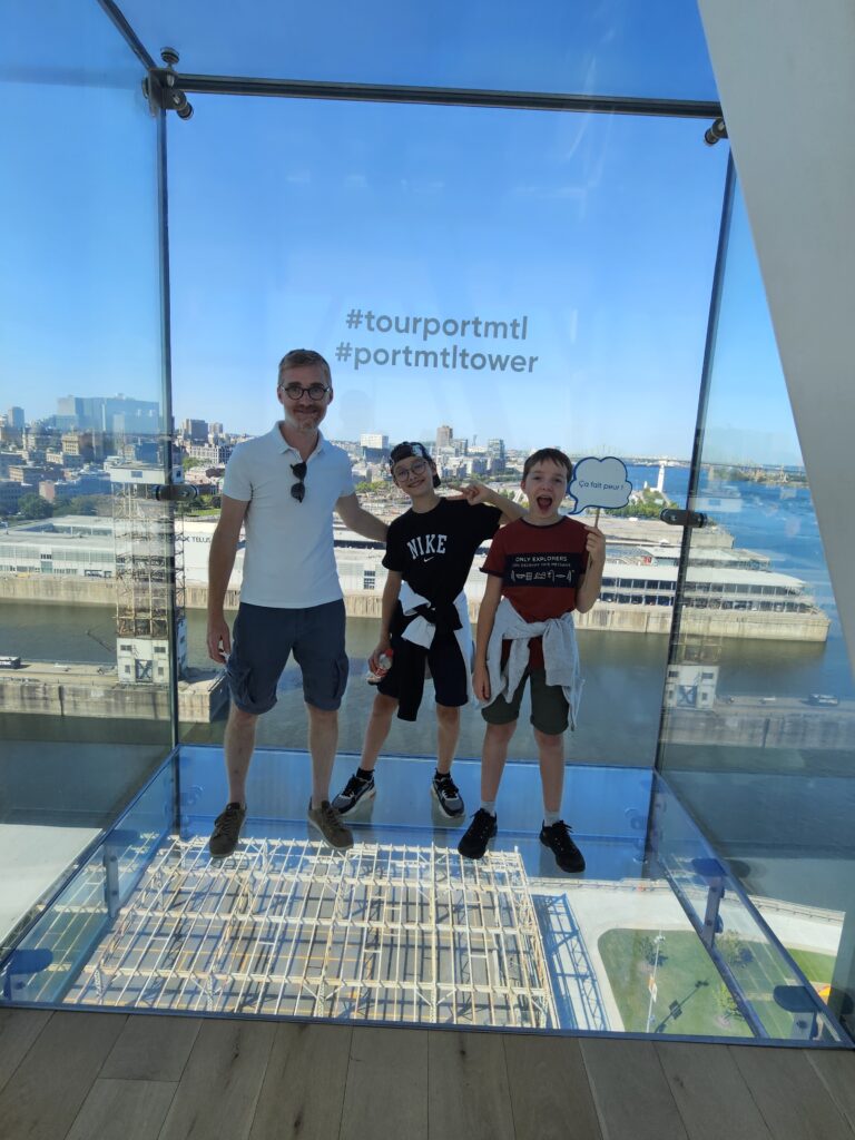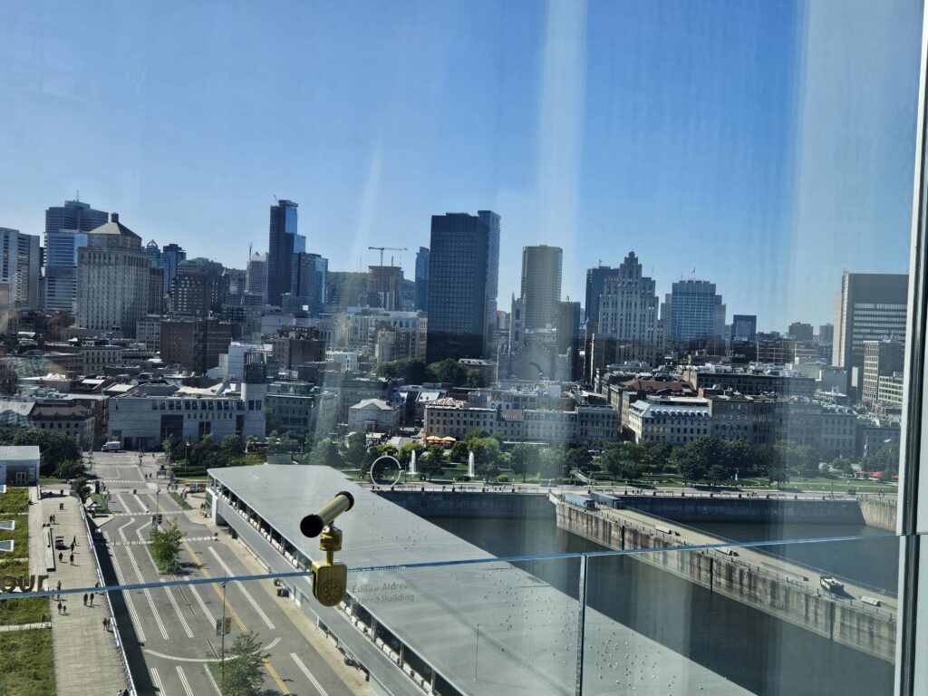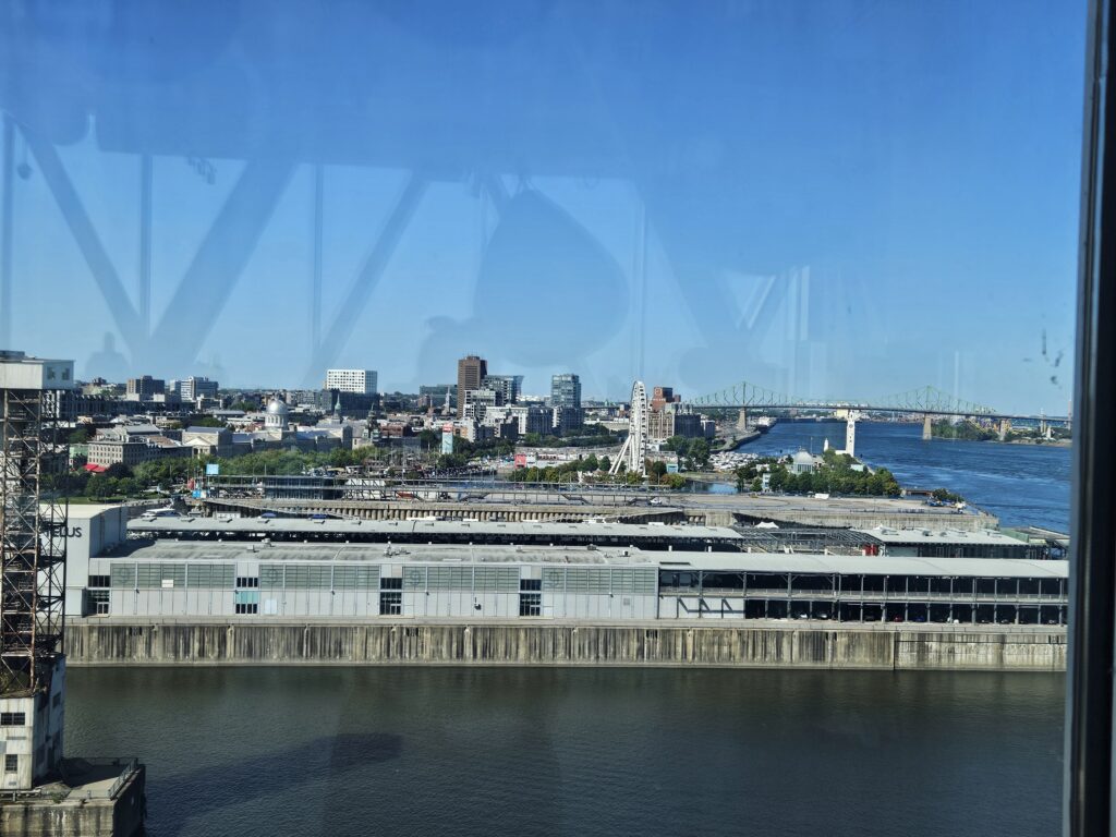 Il fait tellement beau qu’on n’a pas envie de s’enfermer pour visiter les musées de la biosphère. On déjeune sur l’île Sainte-Hélène et nous reprenons le métro pour monter en haut de la tour du port tout en verre.
